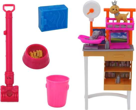 Součástí jsou různé doplňky: pracovní/grooming stanice s policemi a postýlkou, misky na krmení, vysavač, koš, přenosný box a velký plastový pejsek s vodítkem pro „procházky“. Hravou formou rozvíjí jemnou motoriku, sociální dovednosti a představivost.