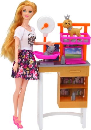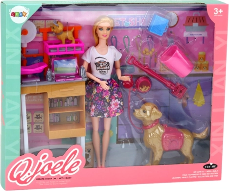 Tento barevný set propojuje svět fantazie a učení – panenka v květovaných šatech se stará o psy a kočku, koupe je, kartáčuje, váží a krmí. Děti si vyzkouší roli pečovatele i malého veterináře a naučí se, že součástí péče je i úklid po mazlíčcích.