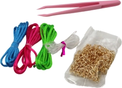 Díky různobarevným šňůrkám (růžová, zelená, modrá), vlascu a doplňkům si děti mohou navrhnout šperky pro různé příležitosti. Součástí jsou i roztomilé gumičky a sponky do vlasů a závěsné náušnice na zacvaknutí – vhodné i pro děti bez propíchnutých uší.