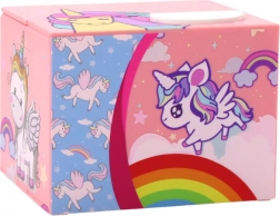 Růžová krabička s kouzelnými ilustracemi jednorožců krásně zapadne do dětského pokoje a láká k častému používání.