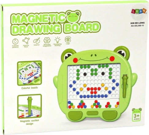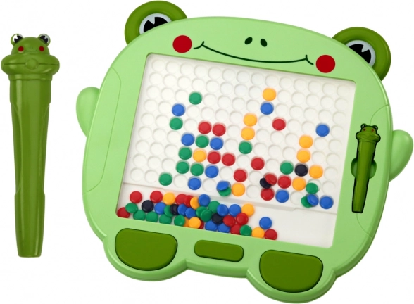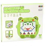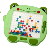Tato roztomilá zelená magnetická tabule ve tvaru žabky je skvělým pomocníkem pro rozvoj kreativity a soustředění. Velká bílá plocha s výstupky slouží jako podklad pro barevné magnetické korálky (černé, modré, žluté, červené, zelené), které děti skládají do obrázků pomocí magnetického rysíku. Průhledná stěna chrání výtvor před náhodným rozmazáním.