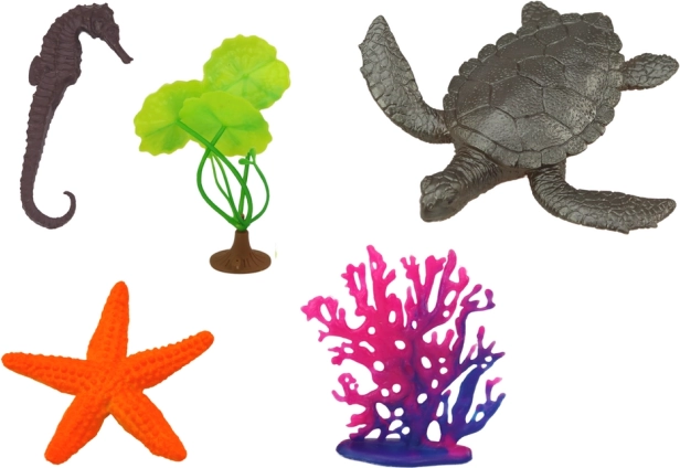 Součástí jsou i plastové rostliny a korály pro vytváření autentických podmořských scén a rozvoj smyslové i kreativní hry.