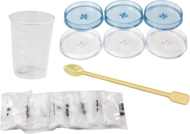 Petri misky, odměrka, míchátko a balíčky s potřebnými směsmi – začněte experimentovat hned po rozbalení.