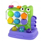 Zábavný a vzdělávací panel ve tvaru dinosaura kombinuje hru Whac‑a‑Mole, sorter tvarů, posuvné písmenka A–E a otáčecí ozubená kolečka. Děti si při hraní rozvíjejí jemnou motoriku, koordinaci ruka‑oko, logické myšlení i rozlišování tvarů a barev. Barevné provedení v zeleno‑fialových tónech láká k objevování a dlouhé zábavě.