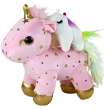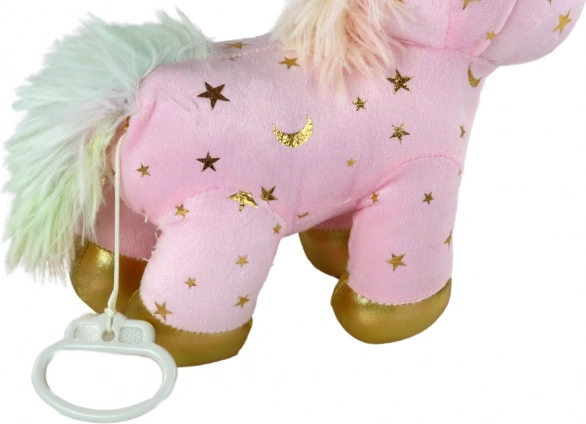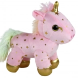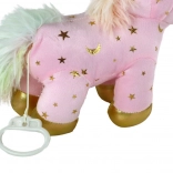 Hebký růžový materiál se zlatými hvězdičkami a třpytivými detaily dělá z jednorožce roztomilého společníka i dekoraci.