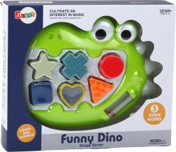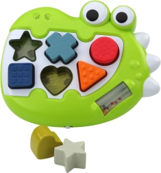 Tento interaktivní dinosaurus spojuje chytrou hru se smyslovou stimulací. Po zapnutí se otvory pro tvary rozsvítí a při správném vložení dílku zazní radostná melodie, která dítě motivuje k dalším pokusům. Děti se přirozeně učí poznávat tvary a barvy, procvičují koordinaci oko–ruka a objevují zvukové i hmatové podněty.
