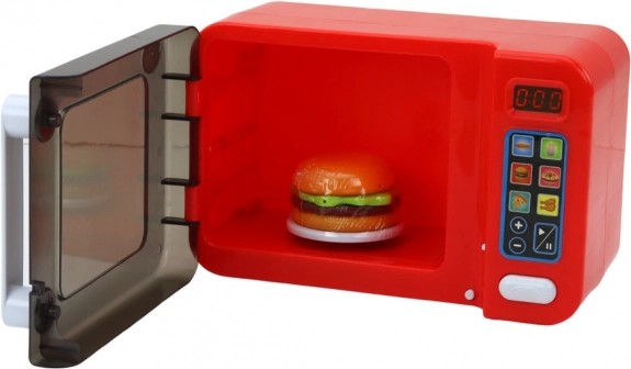 Interaktivní dětská mikrovlnná trouba v červené barvě promění kuchyňskou hru v realistický zážitek. Nabízí světelné efekty, otáčející se talíř, otevírací dvířka a programy ohřevu. Součástí jsou doplňky – hamburger, hranolky a hot dog. Bezpečná zábava pro děti od 3 let, napájená 3× AA (součást balení).