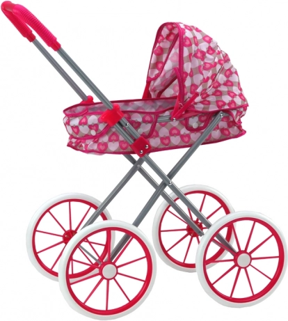 Roztomilý růžový kočárek pro panenky se vzorem srdíček potěší každou malou maminku. Nabízí stylový design, velká pěnová kola pro hladkou jízdu, skládací stříšku a snadné složení pro praktické ukládání. Skvělý pro rozvoj fantazie, empatie a sociálních dovedností.