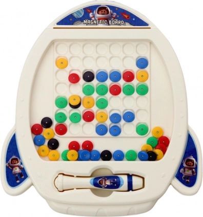Tato jedinečná magnetická tabule nabízí neomezené možnosti pro malé umělce. Sada obsahuje barevné korálky v odstínech červené, žluté, zelené, modré a černé, které lákají k tvorbě fantastických obrázků a vzorů. Speciální magnetické pero umožňuje dětem volně manipulovat s korálky, což rozvíjí přesnost pohybů a manuální zručnost.