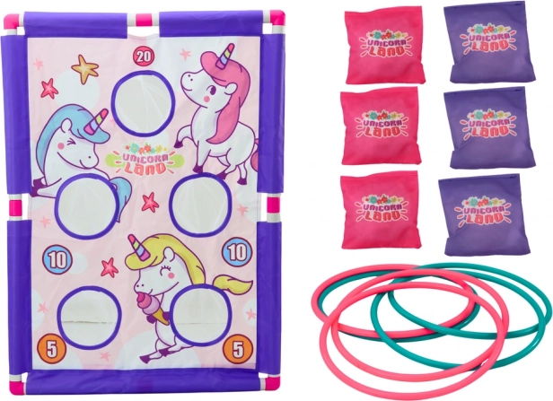 Zábavná zručnostní hra s motivem jednorožců pro děti od 3 let, která podporuje motoriku, soužití v týmu a koncentraci. Barevná cílová plansza se systémem bodování, stabilní házecí sáčky a kroužky přinášejí hodiny bezpečné a napínavé zábavy doma i venku. Certifikace CE a shoda s EN71.