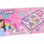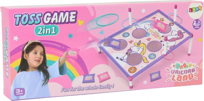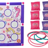 Vstupte do kouzelného světa jednorožců s rodinnou hrou 2v1 – házení sáčky a házení kroužků. Děti si procvičí přesnost, koordinační dovednosti a trpělivost, zatímco si užijí férovou soutěž díky přehlednému bodování na barevné planszy s jednorožci.