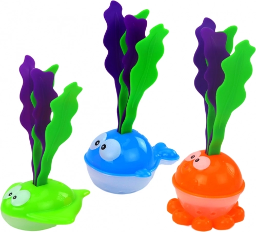 Tři barevné rybky s hravými „řasami“ plavou na hladině a vybízejí k chytání – ideální pro trénink koordinace a trpělivosti.