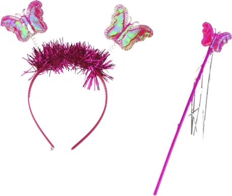 Set doplňují hravá čelenka s motýlky a růžová hůlka, které dětskému převleku dodají skutečné kouzlo.