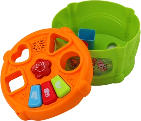 Interaktivní dětská hračka ve tvaru bubnu s barevným designem kombinuje zábavu s učením. Je vybavena otvory pro různé geometrické tvary a tlačítky označenými 'A', 'B' a 'C', což dětem pomáhá naučit se tvary a písmena.