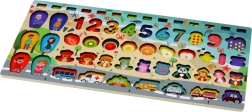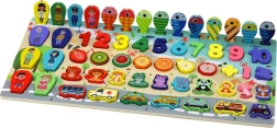 Tato kvalitní dřevěná tabule nabízí bohatou škálu aktivit: děti třídí číslice, poznávají zvířátka, ovoce, vozidla i členy rodiny a pomocí magnetické udice chytají rybičky. Hra zábavnou formou rozvíjí slovní zásobu (včetně angličtiny), soustředění a přesnost pohybu.