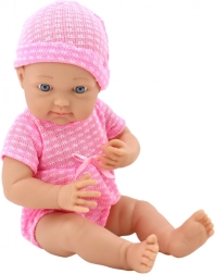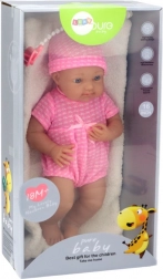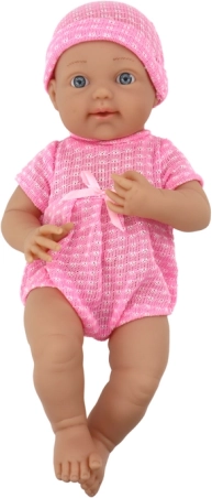 Textilní růžový komplet s čepičkou, realistické rysy a modré oči dodávají panence kouzlo. Praktický dudlík na šňůrce se neztratí a umocní herní scénáře péče.