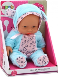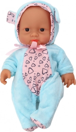 Roztomilá malá panenka – miminko v modrém oblečku se srdíčky a čepičkou s oušky potěší každou holčičku. Má pohyblivé ruce a nohy, otočnou hlavu a díky kompaktním rozměrům 21 × 14 × 6,5 cm se hodí na cesty i do dětské postýlky. Hračka je certifikovaná CE a splňuje normu EN71, vhodné od 3 let.