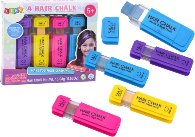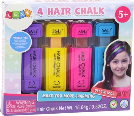Objevte hravou proměnu účesu během chvilky! Tato sada obsahuje 4 smývatelné křídy na vlasy, které vytvoří intenzivní proužky, duhové odlesky i ombre efekt. Barvy se snadno nanášejí, jsou vhodné pro všechny typy a odstíny vlasů a po zábavě je jednoduše smyjete běžným šamponem. Ideální kreativní zábava pro děti od 5 let s certifikací CE a v souladu s EN71.