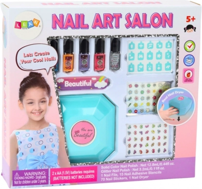 - Barevné laky na nehty, ozdobné nálepky, sušička na nehty