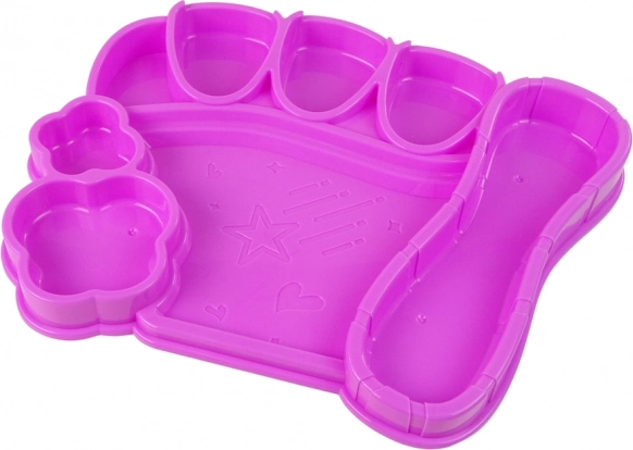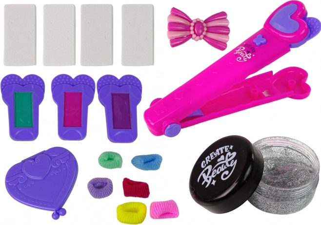 Balení obsahuje křídy v barvách růžová, zelená a fialová, dětskou žehličku pro aplikaci, 6 gumiček, 3 tamponky na setření křídy, sponku, hřeben a zrcátko.