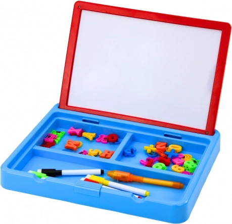 Pod tabulí je praktický schovávek se 3 přihrádkami na všechny doplňky – markery, magnetická písmena a číslice jsou součástí balení. Oboustranné provedení umožňuje více způsobů tvoření a učení, a díky snadnému mazání mohou děti tvořit stále dokola.