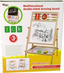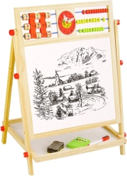 Oboustranná tabule 2v1 kombinuje křídovou a bílou popisovací plochu, takže děti mohou psát křídami i fixy. Dřevěná konstrukce je stabilní a bezpečná, skvěle se hodí pro každodenní kreslení, psaní a první školní dovednosti.