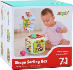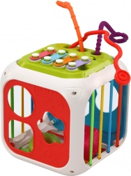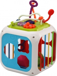 Dítě může trénovat rozpoznávání tvarů a barev tím, že vkládá kostky do odpovídajících otvorů ve třídící kostce. To je vynikající způsob, jak rozvíjet manuální dovednosti a pohybovou koordinaci. Vyjímatelná stěna krychle skrývá další atraktivní prvky, jako jsou cymbálky, ozubená kola a provázky pro interaktivní hru.