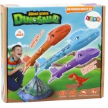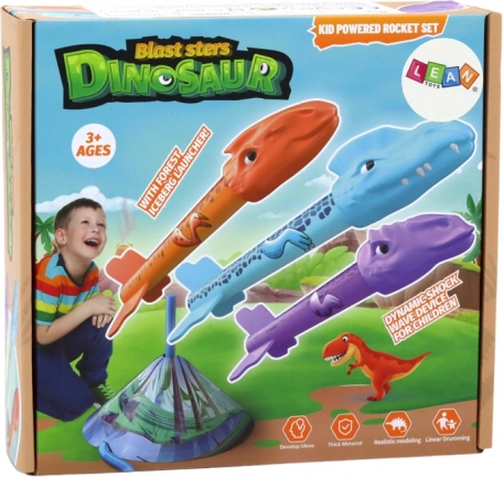 Sada obsahuje tři rakety ve tvaru dinosaurů v různých barvách (oranžová, modrá, fialová), což zajišťuje pestrou hru.