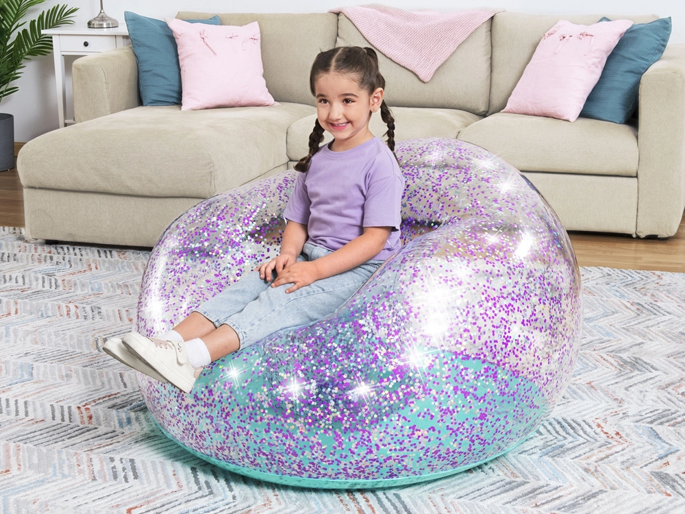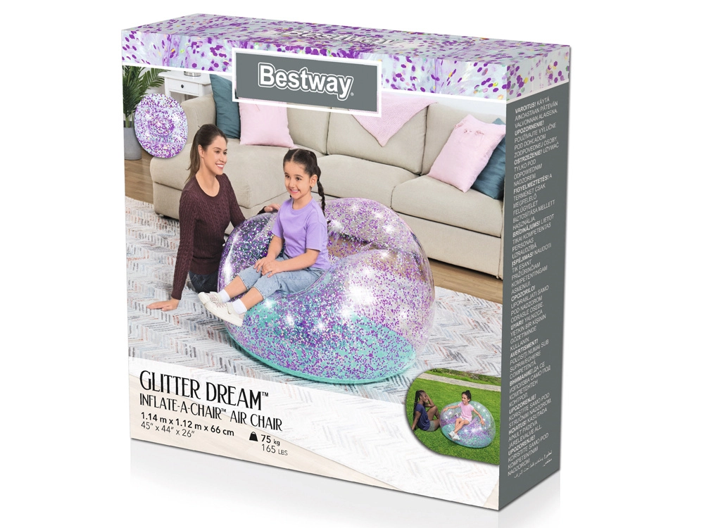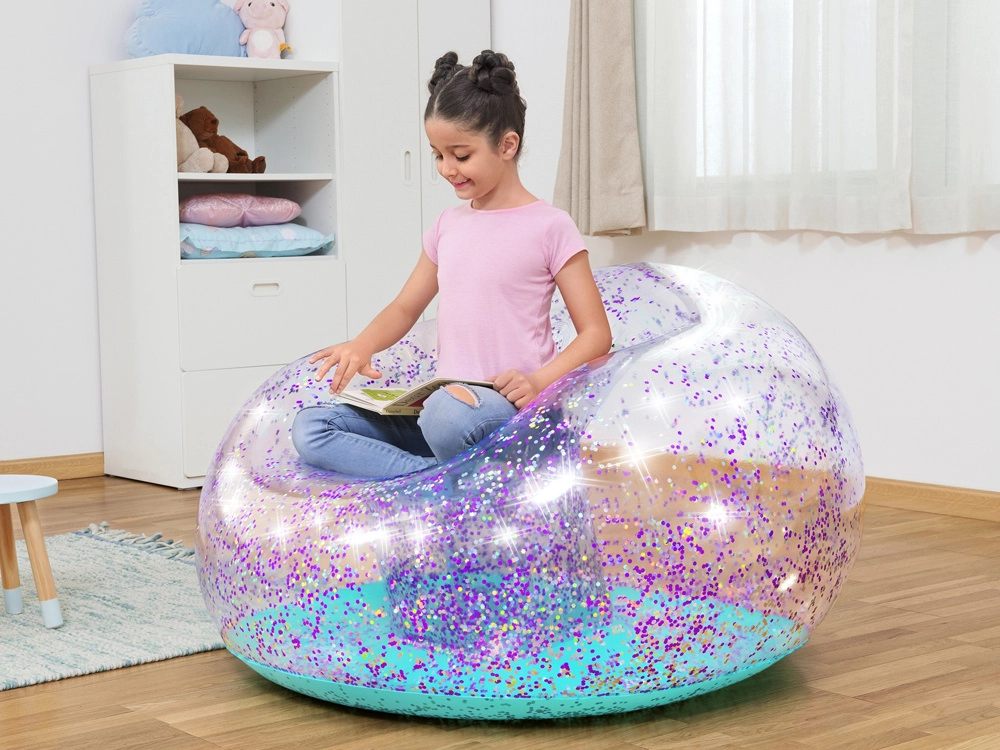 Stylová nafukovací pufa BESTWAY Glitter Dream rozzáří každý dětský pokoj i zahradu. Průhledný PVC materiál s jiskřivým brokátem působí moderně a zábavně, zatímco měkké sedací místo poskytuje pohodlný odpočinek při čtení, hraní i relaxu. Vhodná pro vnitřní i venkovní použití, lehká na přenášení a skladování.
