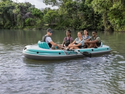 Díky materiálu Inflata‑Shield je člun odolný proti propíchnutí, omezuje nežádoucí roztažení a zlepšuje přilnavost povrchu. Dva nafukovací sedáky s opěrkami a nafukovací podlaha zajišťují pohodlí při pádlování i rybolovu. Integrované držáky na pruty, úchyty na pádla a možnost osadit držákem motoru do 1,5 HP rozšiřují využití na klidných vodách.