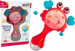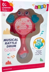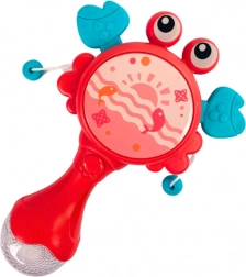 Interaktivní krab s bubínkem přináší dětem pestrou zábavu a zároveň je učí rozlišovat barvy, zvuky a tvary. Při pohybu chrastí kuličkami v průhledné části rukojeti, LED diody střídají barvy a po stisku červeného tlačítka ve tvaru tlapky se přehrávají melodie, zvuky zvířat a hudební nástroje.
