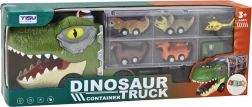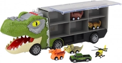 Objevte zábavu s dinosauřím náklaďákem, který kombinuje přepravník autíček a svět dinosauřů. Přední část zdobí velká hlava dinosaura, nechybí světelné efekty a realistické zvuky náklaďáku i řev dinosaura. V návěsu je místo pro celou sbírku a v balení najdete 6 vozidel včetně 4 dinosauřích autíček, auta s přívěsem a helikoptéry.
