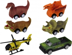 Součástí balení jsou 4 dinosauří resoráky, auto s přívěsem a helikoptéra – ideální mix pro pestrou a nápaditou hru.