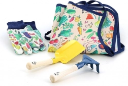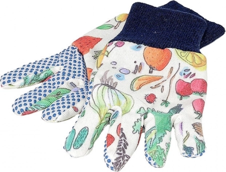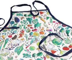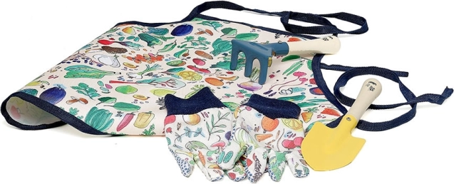 Pestrobarevné vzory na zástěře a rukavicích dělají ze zahradničení radostnou aktivitu.