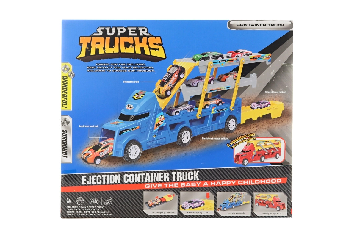 Objevte akční svět silnic s velkým kamionem a sadou 6 závodních autíček. Vystřelovací plošina se snadno připojí k zadní části kamionu a po stisku tlačítka vystřelí autíčko do jízdy skrz podvozek kamionu. Děti si užijí spoustu zábavy a při hře rozvíjejí koordinaci, kreativitu a soutěživost.