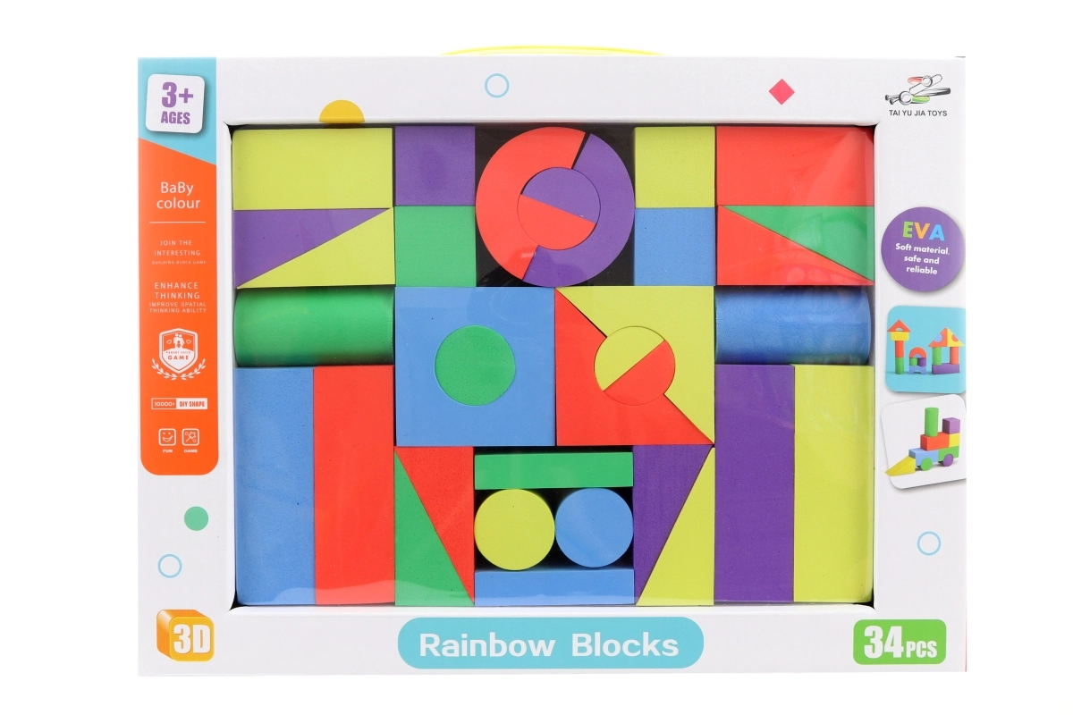 Zábavná sada 34 pěnových kostek v různých tvarech a barvách pro kreativní stavění. Bezpečný materiál, lehké a příjemné do ruky. Ideální pro rozvoj motoriky, fantazie a barevného vnímání. Vhodné pro děti od 3 let, baleno v praktické krabici.