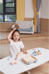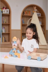 Kostky jsou vyrobeny z bukového dřeva, jsou natřené v harmonických barvách a zabezpečené pro děti. Po hře mohou být kostky uložené zpět do vozíčku, což umožňuje snadné uspořádání. Díky šňůrce může dítě vozíček s kostkami tahat podél podlahy, což je nejen zábavné, ale i praktické.