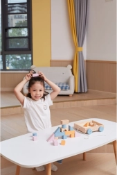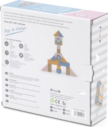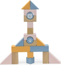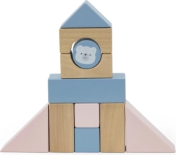 20 kostek v různých pastelových barvách a tvarech podporuje kreativní stavění a rozvoj rukodělných schopností.