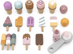 Stánek obsahuje různé druhy dřevěných zmrzlin, které umožňují dětem vytvářet vlastní zmrzlinové kombinace.