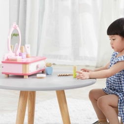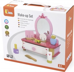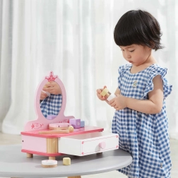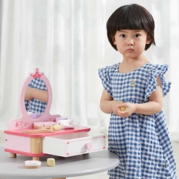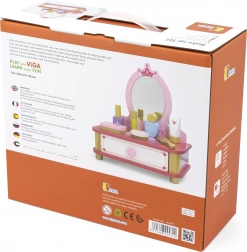Krásná růžová toaletka od značky Viga je ideálním doplňkem do každého dětského pokoje. Set obsahuje zrcadlo, výsuvnou zásuvku a různorodé dřevěné doplňky pro vytvoření kouzelného světa plného fantazie. Vyrobena z kvalitního dřeva a natřena netoxickými barvami bezpečnými pro děti.