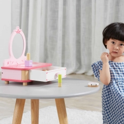 Viga dřevěná toaletka nabízí zrcadlo a prostornou zásuvku, kde malé princezny mohou uchovat své poklady. Růžové provedení dodává výrobku elegantní vzhled a skvěle zapadne do dětského pokoje.