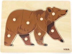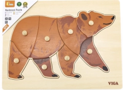 Tato smyslová a vzdělávací hračka inspirovaná Montessori metodou vede děti k objevování tvarů a skládání obrázku medvěda. Velké dřevěné kolíčky usnadňují manipulaci, takže se děti učí přesně vkládat dílky a posilují přitom jemnou motoriku.