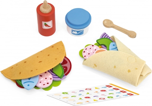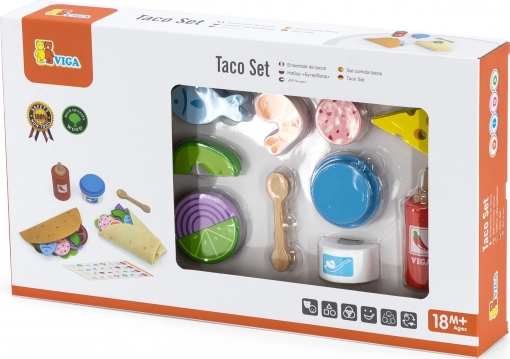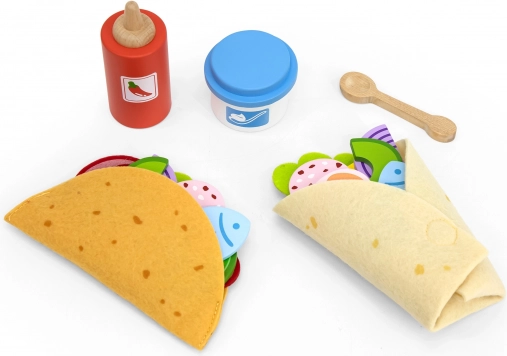 Sada VIGA na taco a burrito přináší dětem autentický zážitek z vaření. Měkké filcové tortilly a pestré dřevěné kousky potravin (zelenina, sýr, ryba aj.) vybízejí k míchání chutí a tvoření vlastních receptů. Díky příslušenství jako je láhev omáčky, „jogurt“ miska a dřevěná lžička je hra ještě pestřejší.