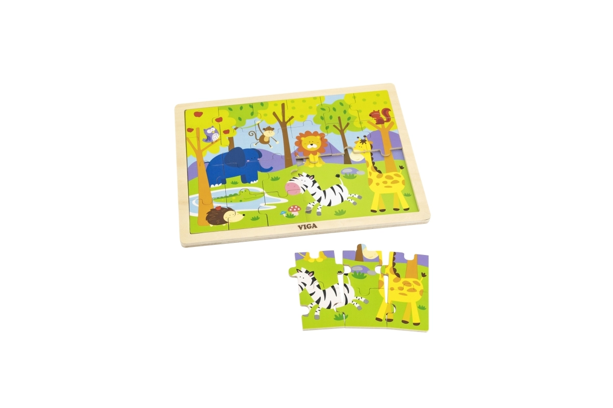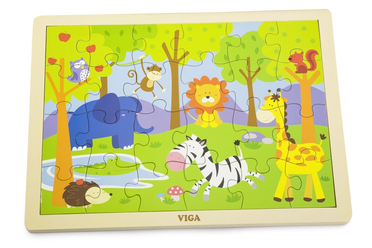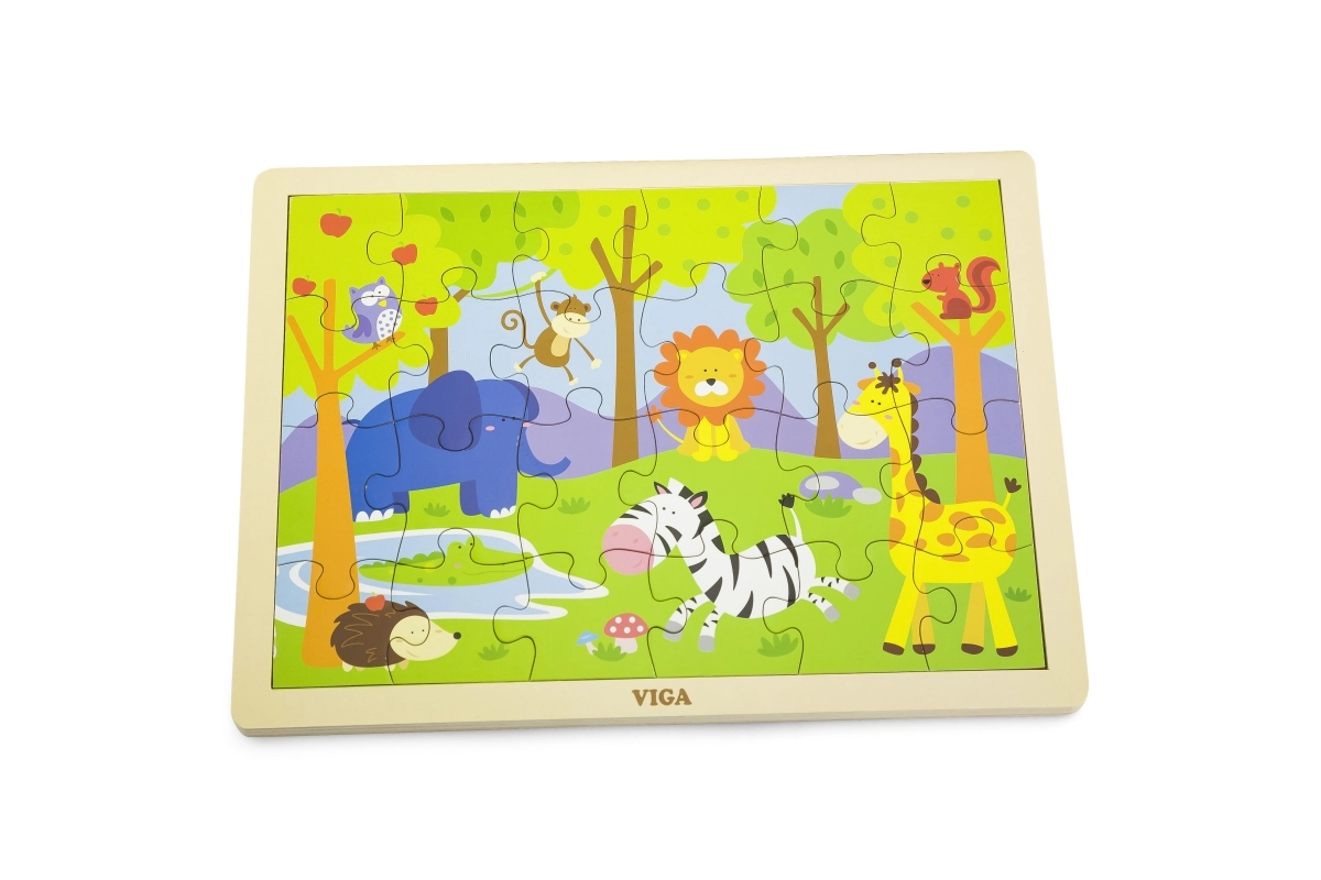 Dřevěné puzzle s veselými zvířátky ze zoo jsou ideální první skládačkou pro nejmenší. Díky 24 pevným dílkům a stabilnímu dřevěnému rámu si děti procvičí trpělivost, soustředění i prostorovou představivost. Barevné motivy lva, zebry, žirafy či slona děti snadno zaujmou a podpoří přirozené učení hrou.