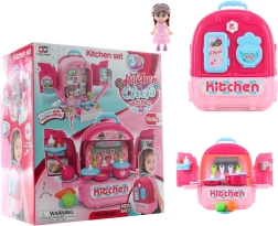 Krásná velká sada nádobí v batohu, ideální pro malé kuchařky. Tato multifunkční hračka může sloužit jako kuchyňská sada, hrací sada s panenkou nebo praktický batůžek.