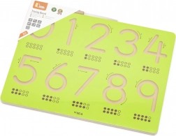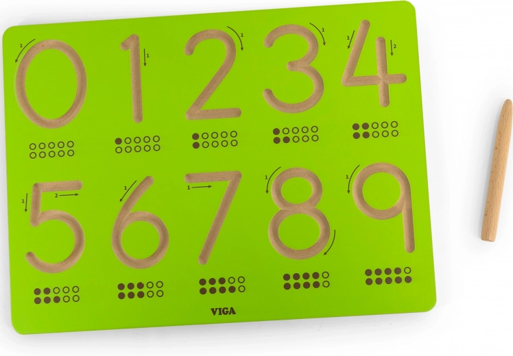 Tato kvalitní dřevěná tabulka s vyfrézovanými čísly 0–9 je ideální pomůckou pro první kroky k psaní. Dítě pomocí dřevěného pera sleduje zakřivené drážky se směrovými šipkami, čímž si upevňuje správný tvar číslic, rytmus a paměťové stopy pro hladší přechod k psaní tužkou.