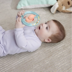 - Husička s kroužky: Pastelově barevné kroužky, které při pohybu klapají, podporují sluchové vnímání.