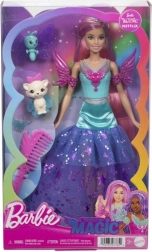 Panenka BARBIE Malibu Roberts přináší pohádkové dobrodružství inspirované sérií Špetka kouzel. Září v vrstvených šatech s třpytivou tylovou sukní posetou hvězdami, jemnými akcenty křídel u výstřihu a blyštivými manžetami na pažích, které dotvářejí její kouzelný vílí styl.