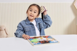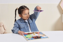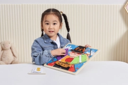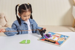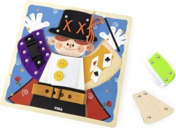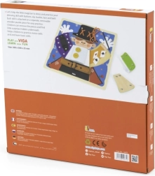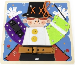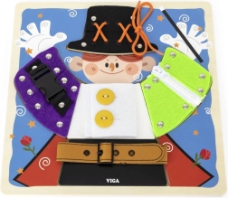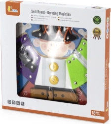 Zábavná dřevěná tabule od značky VIGA s motivem malého kouzelníka učí děti od 18 měsíců základům oblékání a sebeobsluhy. Při hře si procvičí zipy, knoflíky, patentky, přezky a tkaničky, rozvíjejí jemnou motoriku, koordinaci oko–ruka i samostatnost. Pod oblečením jsou navíc ukryté kouzelnické prvky, které poslouží jako hravá paměťová aktivita.
