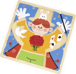 Pod díly oblečení se skrývají kouzelnické motivy (králíček, karty, holubice, kytice), které podpoří paměť, soustředění i představivost.